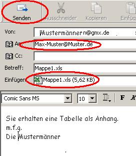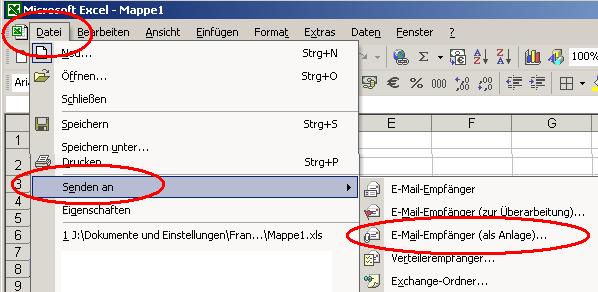 Thema: Mozilla Browser, der ganze Seiten druckt. Einfach in einem Verzeichnis auspacken und eine mit: "mozilla.exe" erstellen. GanzeSeite mit mozilla.zip drucken Excel-Listen (Mappen) aus Excel verschicken.Am Beispiel von Excel 2002 - XP.Es wird davon ausgegangen, dass ein lauffähiges Mailprogramm auf Ihrem Rechner installiert ist, dass von Excel angesprochen wird. (Z.B. Outlook Express) (wenn nicht, dann lesen Sie hier weiter) Sie haben eine Excel Mappe erstellt: Mustertabelle.XLS Wir gehen davon aus, dass die Tabelle schon auf dem Rechner gespeichert wurde. Zum Verschicken öffnen Sie unter --Datei / Senden an-- den Abschnitt E-Mail-Empfänger als Anlage. Tragen Sie die Empfänger-Adresse ein und senden Sie die Tabelle ab. Sollte der Empfänger die Mail nicht empfangen können, weil eine Firewall oder ein email-Virenscanner den Anhang ausfiltert, muessen Firewall und Virenscanner ausgeschaltet werden. Oder sie packen die Datei besser als Zipdatei ein und verschicken diese Datei dann als Zip-Anhang mit dem Mailprogramm, welches auf Ihrem Rechner zur Verfügung steht. Sie können die Datei auch per Webmail Programm, unter z.B. WWW.GMX.DE (oder was Sie sonst eingerichtet haben) verschicken. Weitere Fragen an: den Admin dieser Seite. |