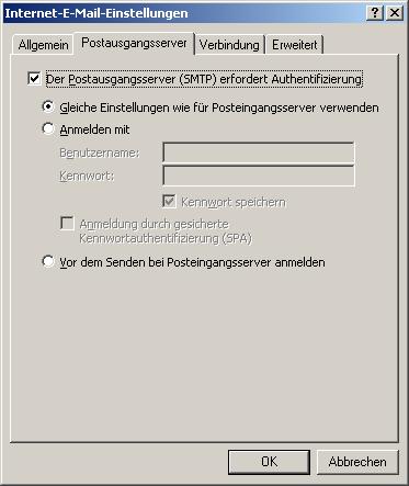 In der Karte -Postausgangsserver- wählen Sie Authentifizierung